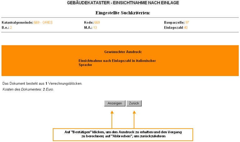 Bevor das Dokument mit der gewünschten Einsichtnahme angezeigt wird, wird die Übersicht über die verlangten Daten und die Anzahl der Blöcken, aus denen sich das gefundene Dokument zusammensetzt, eingeblendet. Sie können nun entscheiden, ob Sie den Vorgang bestätigen und infolgedessen bezahlen oder diesen abbrechen wollen. Ein Beispiel dazu ist hier abgebildet: |