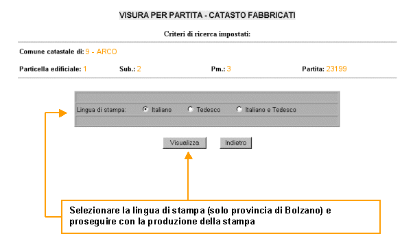 La Visura per Partita riporta la lista delle unità immobiliari e degli intestati collegati alla partita. Una volta selezionata la lingua di stampa (solo per la provincia di Bolzano) si procede con la produzione del documento. |