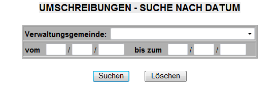 Aus der HOMEPAGE wählen Sie "Gebäudekataster - Verzeichnis Umgeschriebener Liegenschaften" aus und klicken Sie dann auf die Schaltfläche ok. Es wird eine Maske eingeblendet, in der Sie die Suchkriterien nach Verwaltungsgemeinde und Zeitraum einstellen können. |