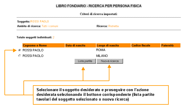 A seguito della Ricerca per persona fisica si ottiene una lista di soggetti rispondenti