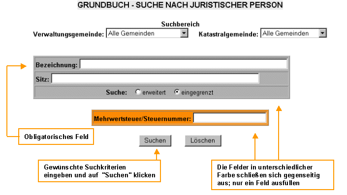 Provinz Aus der HOMEPAGE wählen Sie "Grundbuch - Suche nach juristischer Person" aus und klicken Sie auf die Schaltfläche ok. Es wird eine Maske eingeblendet, in der Sie die Suchkriterien nach den Angaben zur juristischen Person einstellen können. |
