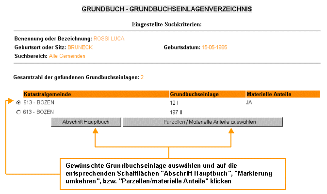 | Grundbuchseinlagenverzeichnis Wenn Sie erfahren wollen, welche Grundbuchseinlagen ein Rechtsinhaber hat, gehen Sie folgendermaßen vor: 1. Suche nach natürlicher bzw. juristischer Person vornehmen; 2. Aus diesem Verzeichnis den Rechtsinhaber auswählen, in dessen Grundbuchseinlagen Sie Einsicht nehmen wollen. Klicken Sie auf die Schaltfläche "Grundbuchseinlagen auflisten" am Ende des Verzeichnisses. Anschließend wird das Verzeichis der Einlagen des ausgewählten Rechtsinhabers eingeblendet. |