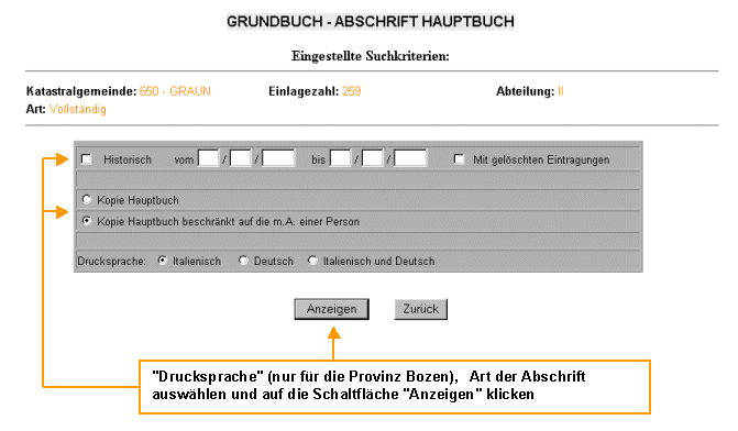 Informationen über den Grundbuchsauszug, der den eingestellten Suchkriterien entspricht,