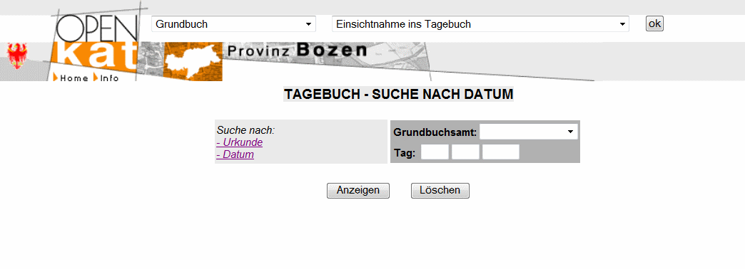 Aus der HOMEPAGE wählen Sie "Grundbuch - Einsichtnahme Tagebuch" aus und klicken Sie dann auf die Schaltfläche ok. Es wird eine Maske eingeblendet, in der Sie zwischen der Suche nach Urkunde oder nach Datum wählen können: