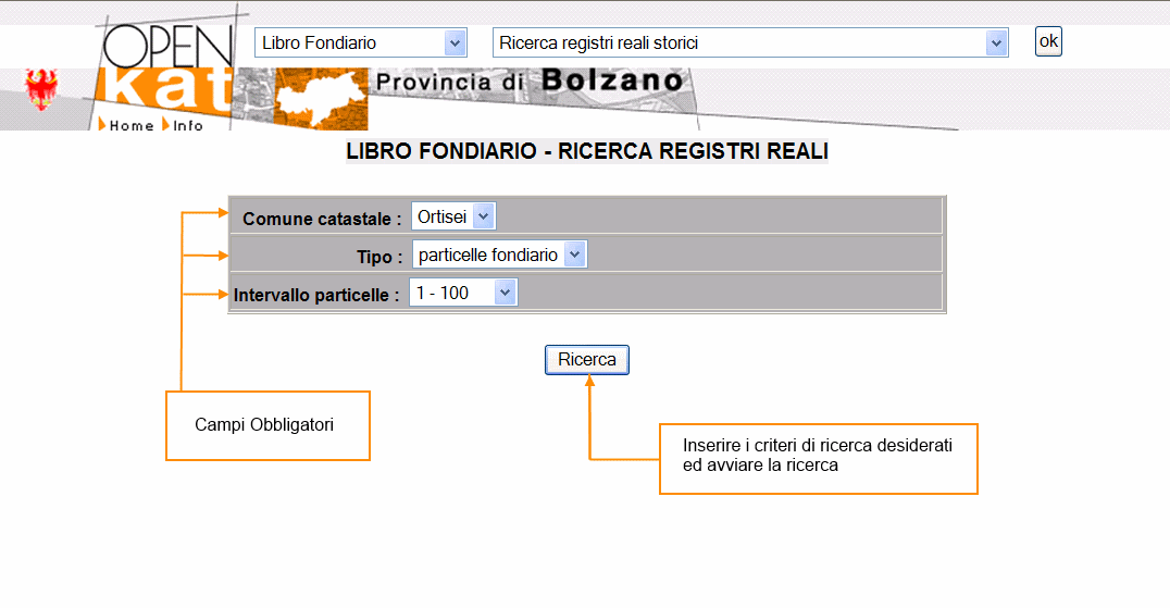Devono essere inseriti il comune catastale, il tipo di particella e se presente l'intervallo di particelle e cliccare sul pulsante 'Ricerca'. VEDI ANCHE: