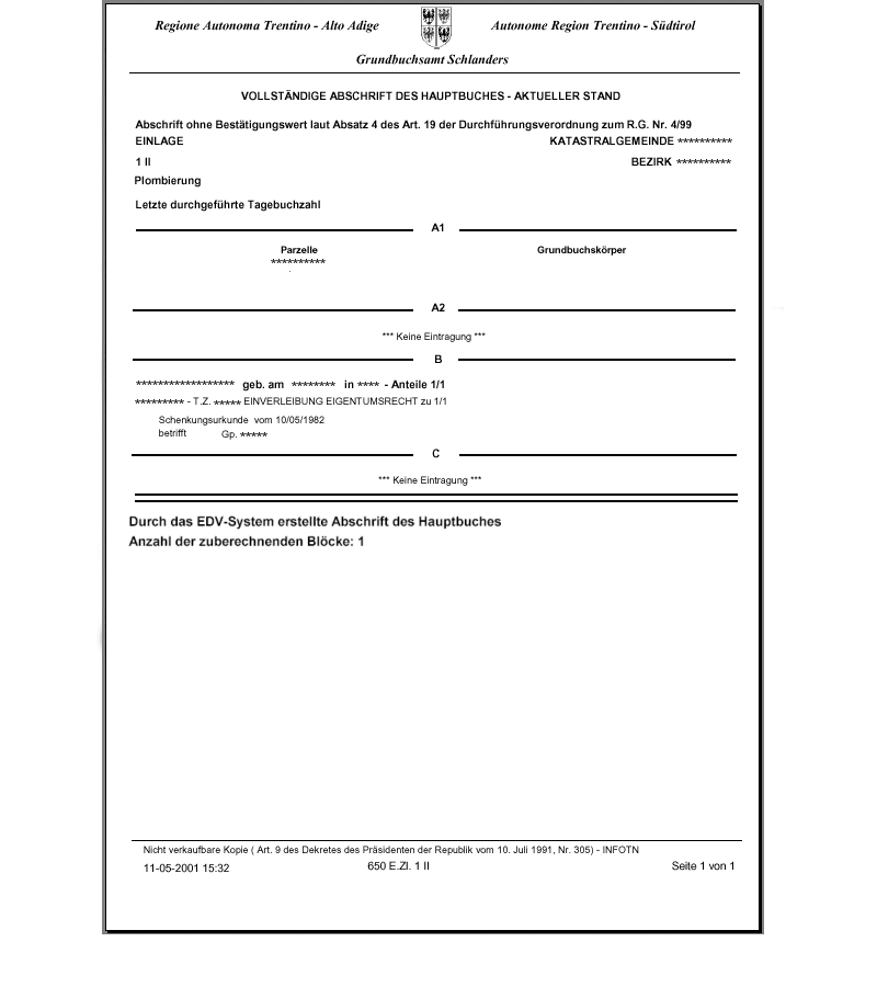 | Abschrift des Hauptbuches Nach Bestätigung der Einsichtnahme wird ein neues Fenster des Browsers automatisch eingeblendet, in dem das PDF-Dokument mit der gewünschten Einsichtnahme angezeigt wird. Das Dokument kann bei Auswahl der entsprechenden Menüpunkte unter dem Befehl "Datei des Menüs" im Fenster des Browsers durch Mausklick auf die Drucker-Ikone gedruckt und durch Mausklick auf die Disketten-Ikone auf eigenem PC gespeichert werden. Folgendes Fenster zeigt ein Beispiel für eine Einsichtnahme: |