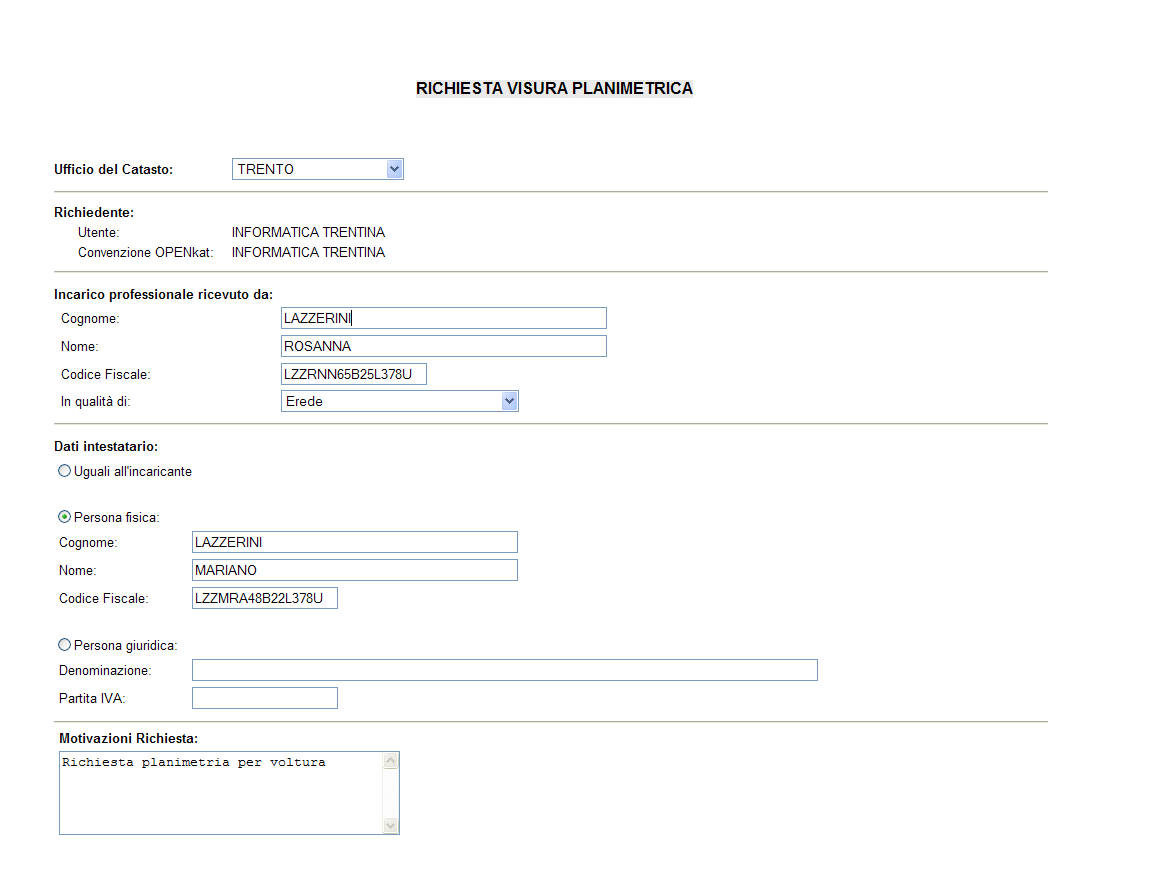 - per gli enti istituzionali (Comuni/enti funzionali) e utenti interni (PAT differenti dagli Uffici del Catasto): sono obbligatori i campi degli intestatari e delle "Motivazioni della richiesta", mentre tutti gli altri campi sono facoltativi (cognome, nome, in qualità di, codice fiscale).