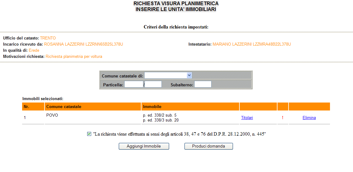 il numero di particella, opzionalmente il denominatore e/o il subalterno, quindi premere sul pulsante "Aggiungi Immobile".