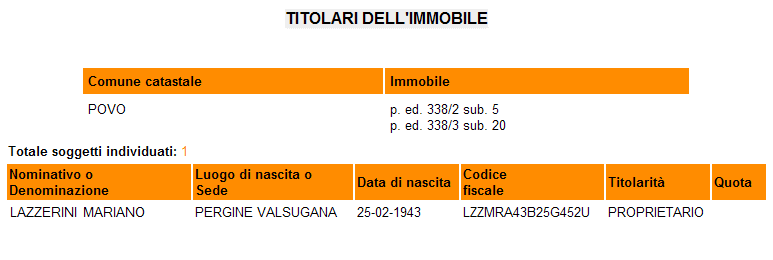 Questa schermata consente di visualizzare rapidamente i titolari di uno degli immobili aggiunti tramite la schermata precedente.