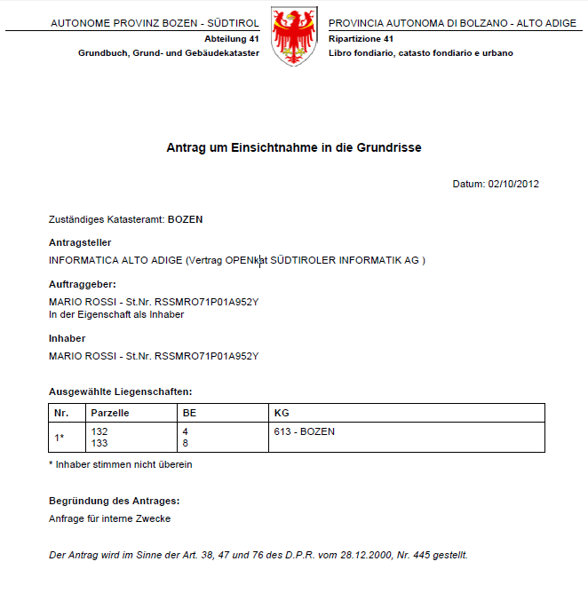 Diese Maske zeigt ein Beispiel einer PDF-Datei mit einem Antrag. Die PDF-Datei enthält als Anlage eine XML-Datei. Die PDF-Datei kann durch das Menü "Telematische Sendung" > "Neues Aktenbündel" an das System gesendet werden. Alle Freiberufler und Notare müssen vor der Sendung die PDF-Datei digital unterschreiben (.p7m). Nach der Sendung kann - wie sich - der Bearbeitungsstand des Antrags durch die Openkat -Funktion "Verzeichnis der Aktenbündel" kontrolliert werden. |
