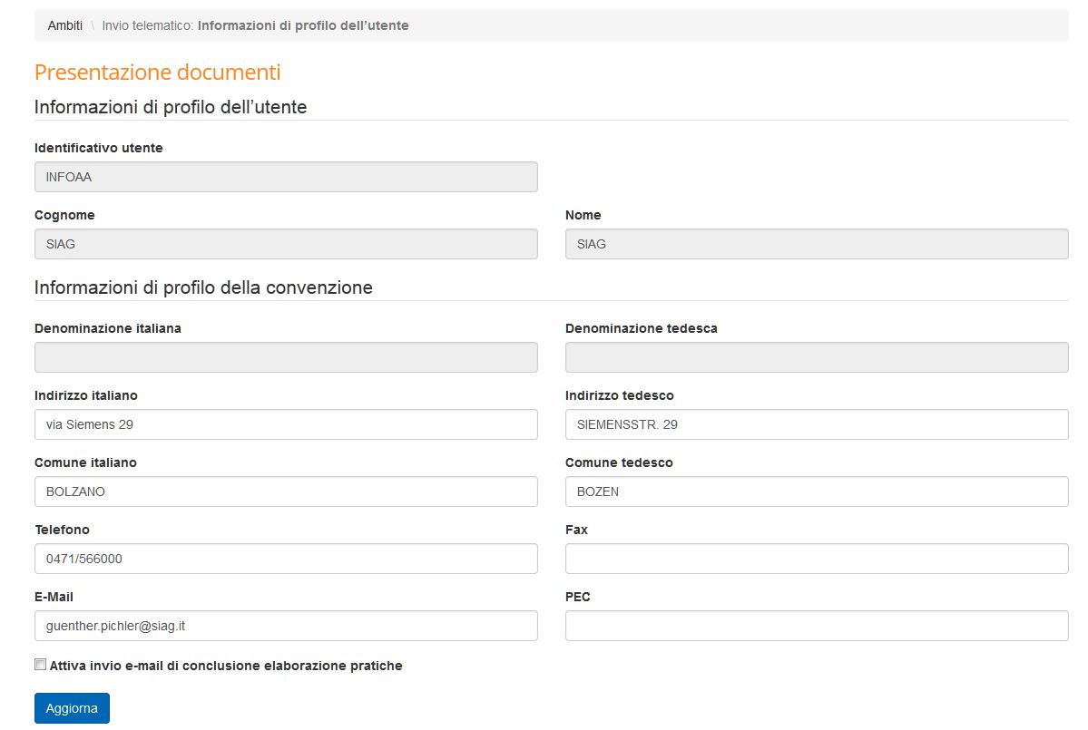 Tramite questa opzione č possibile visualizzare i dati degli utenti collegati alla convenzione Openkat e modificare quelli relativi a indirizzo (via e comune), numero di telefono e di fax, indirizzo e-mail e PEC.