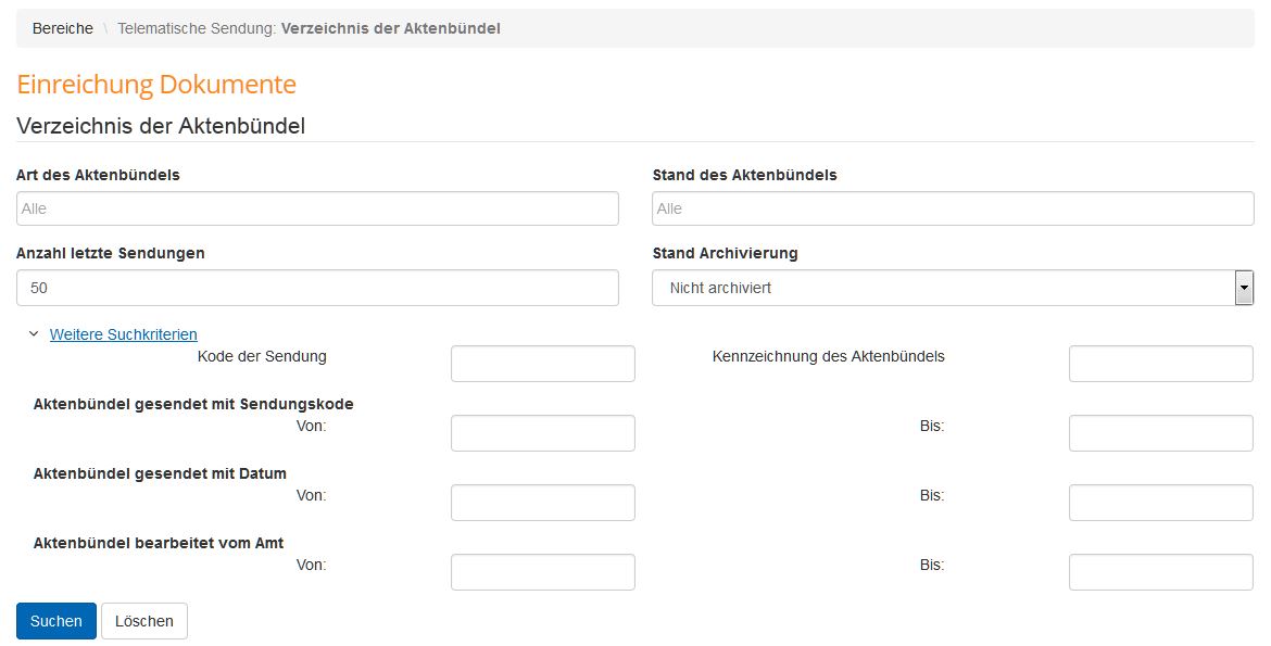 Folgende Felder werden angezeigt: Art des Aktenbündels, Stand des Aktenbündels, Anzahl letzte Sendungen und Stand Archivierung .