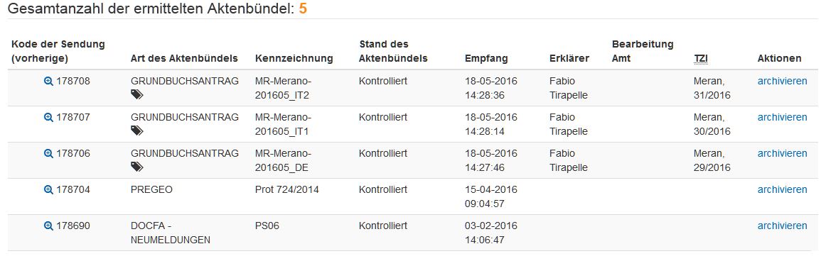 Es werden die Aktenbündel angezeigt, welch mit der Suche ermittelt wurden.