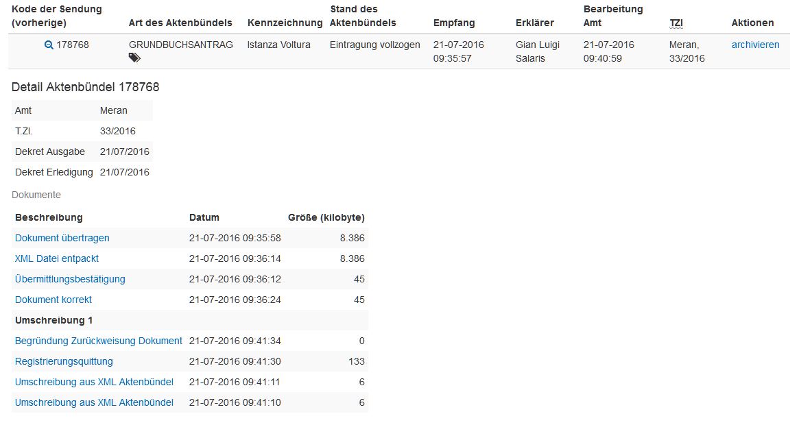 Ein Klick auf die Ikone (Lupe) in der ersten Spalte zeigt das Detail Aktenbündel an. Welche Dokumente dabei angezeigt werden hängt von der Art und vom Stand des Aktenbündels ab. Es kann sich um folgende Dokumente handeln: Übertragendes Dokument, XML Datei entpackt, Übermittlungsbestätigung, Dokument korrekt.