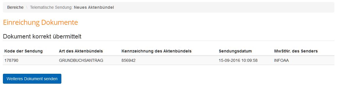 Nach erfolgter Sendung wird Kode der Sendung, Art des Aktenbündels, Kennzeichnung des Aktenbündels, Sendungsdatum und MwStNr. des Senders angezeigt
